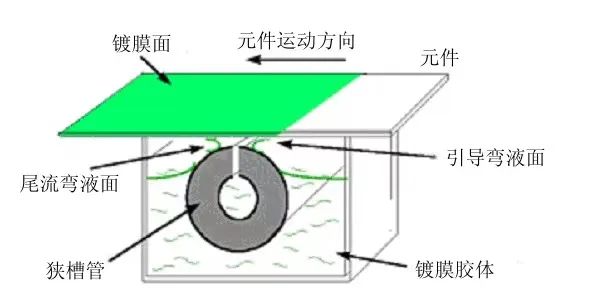彎月麵鍍膜原理如下圖。光學基片的待鍍表麵向下,在膠泵的泵送下,溶膠經過輸送管道進入噴膠管內部,然後透過噴膠管的管壁,在噴膠管的出口形成了均勻向上的溶膠層流。基片的鍍膜麵與噴膠管外表麵最高點之間的距離大約為200 μm,當基片在電機帶動下水平勻速平穩地經過噴膠管上方的時候,鍍膜表麵和噴膠管之間就形成了持續穩定的溶膠彎月麵。隨著基片的前進,溶膠彎月麵就在待鍍表麵上塗布出一層均勻的溶膠液體膜。然後,在適當的條件下幹燥,加速溶膠液中溶劑的蒸發,最終在基片表麵就形成一層均勻的凝膠薄膜。多餘的溶膠由噴膠管外表麵的下向層流收集到回收槽裏,接著,經過回收管道回流到儲膠筒,重新參加鍍膜過程。用於鍍膜的膠體放置在合適儲液箱中,利用離心電機使膠體在噴膠管形成彎月麵,使鍍膜基片平穩平移鍍膜。